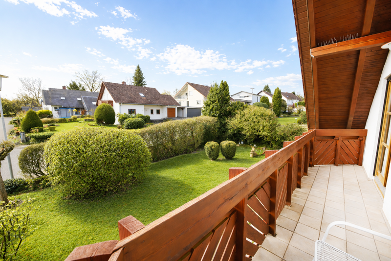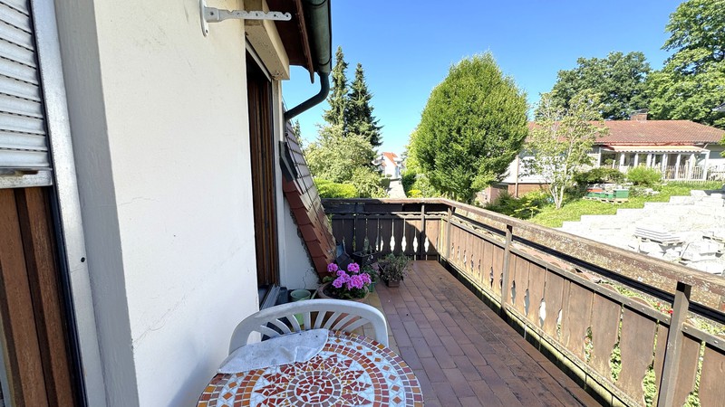 Das Obergeschoss verfügt über einen nach Südosten ausgerichteten Balkon. Es gibt hier außerdem ein separates Duschbad sowie ein großes Badezimmer. Die beiden Schlafzimmer im Obergeschoss sind sehr geräumig und bieten Platz für individuelle Gestaltung. Ein Ankleidezimmer sorgt für Ordnung und Stauraum.
