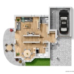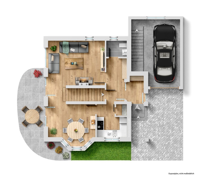 Beim Betreten gelangen Sie in einen Windfang mit Flur, der den Zugang zu den verschiedenen Räumen ermöglicht. Direkt im Eingangsbereich befinden sich eine Garderobennische und ein Gäste-WC. Die Küche ist funktional gestaltet und bietet Platz für eine moderne Ausstattung. Vom Esszimmer aus gelangen Sie in den Wintergarten, der viel Licht und eine angenehme Atmosphäre bietet. Von hier aus haben Sie Zugang zur Dachterrasse mit Pergola, perfekt für entspannte Stunden im Freien. Das große Wohnzimmer lädt zum Verweilen mit Familie und Freunden ein. Angrenzend ans Wohnzimmer befindet sich ein weiteres großes Zimmer, welches vielfältig genutzt werden kann, bspw. als Kinderzimmer, Gästezimmer oder Arbeitszimmer.