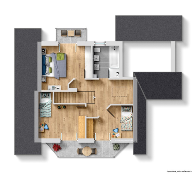 Im Obergeschoss stehen drei Schlafzimmer, ein Tageslichtbad sowie eine praktische Büronische im Flur zur Verfügung. Zwei Balkone bieten zusätzliche Aufenthaltsmöglichkeiten im Freien.